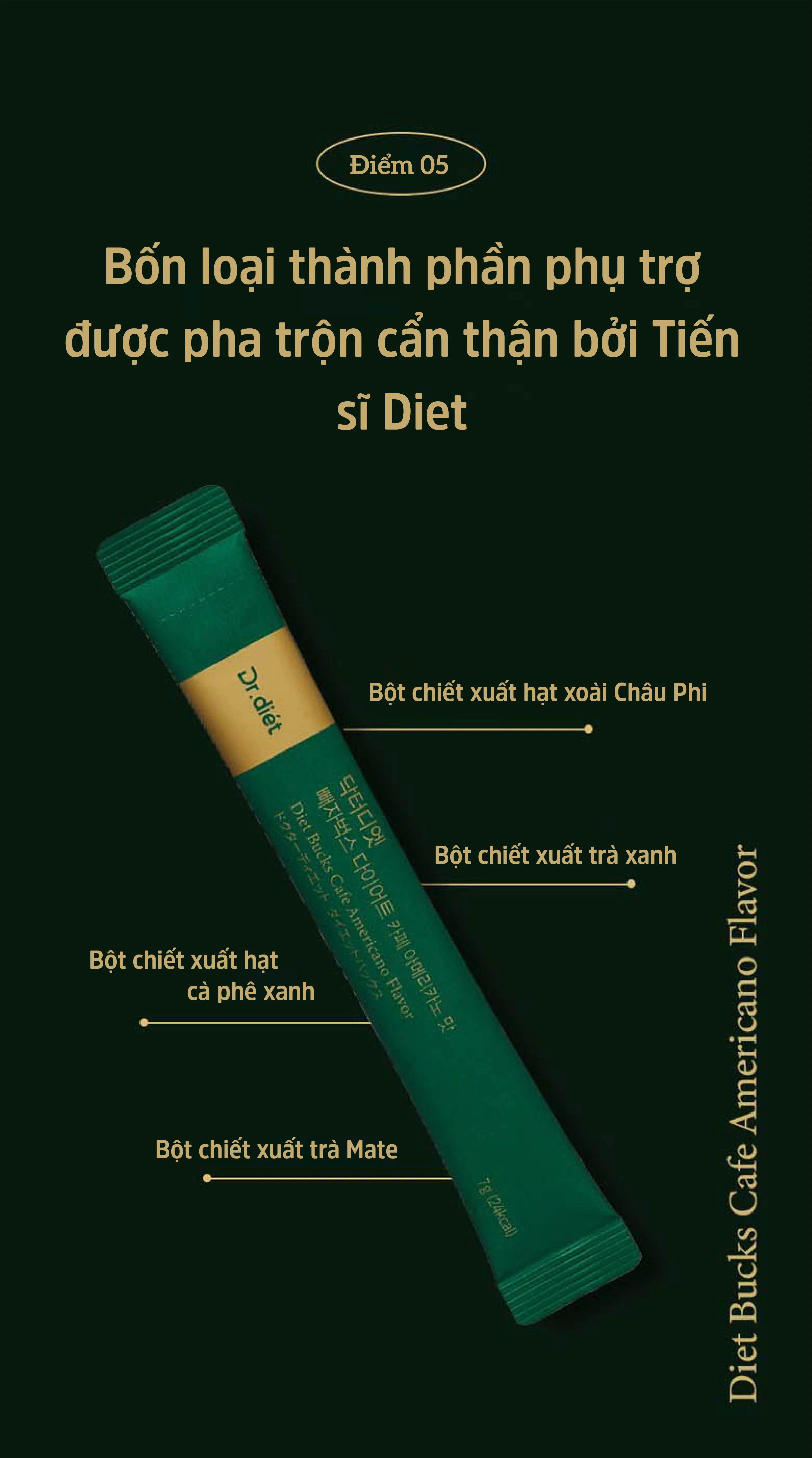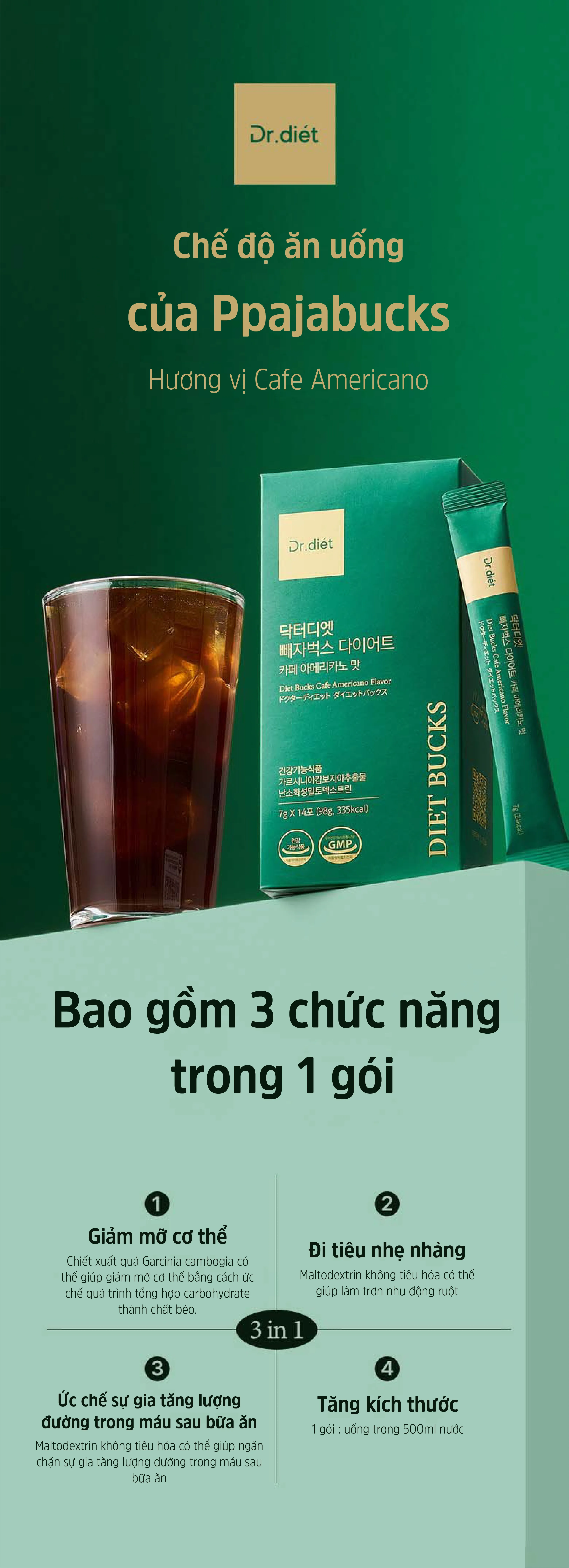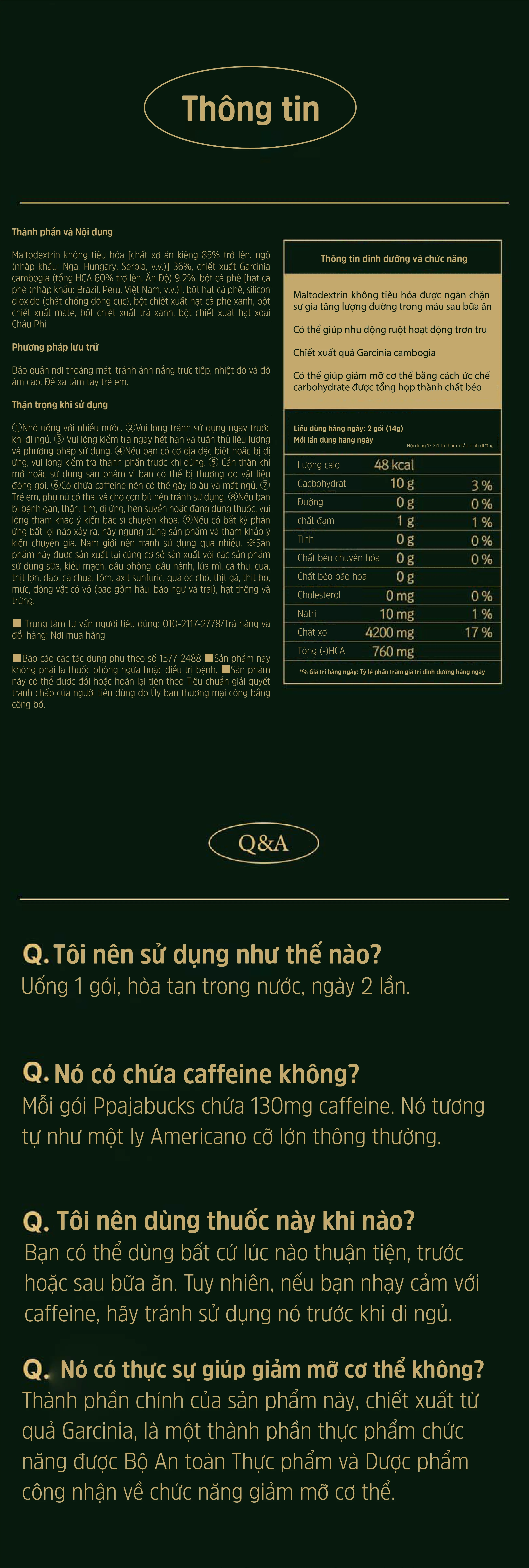 Maltodextrin không tiêu hóa [chất xơ ăn kiêng 85% trở lên, ngô (nhập khẩu: Nga, Hungary, Serbia, v.v.)] 36%, chiết xuất Garcinia cambogia (tổng HCA 60% trở lên, Ấn Độ) 9,2%, bột cà phê [hạt cà phê (nhập khẩu: Brazil, Peru, Việt Nam, v.v.)], bột hạt cà phê, silicon dioxide (chất chống đóng cục), bột chiết xuất hạt cà phê xanh, bột chiết xuất mate, bột chiết xuất trà xanh, bột chiết xuất hạt xoài Châu Phi
