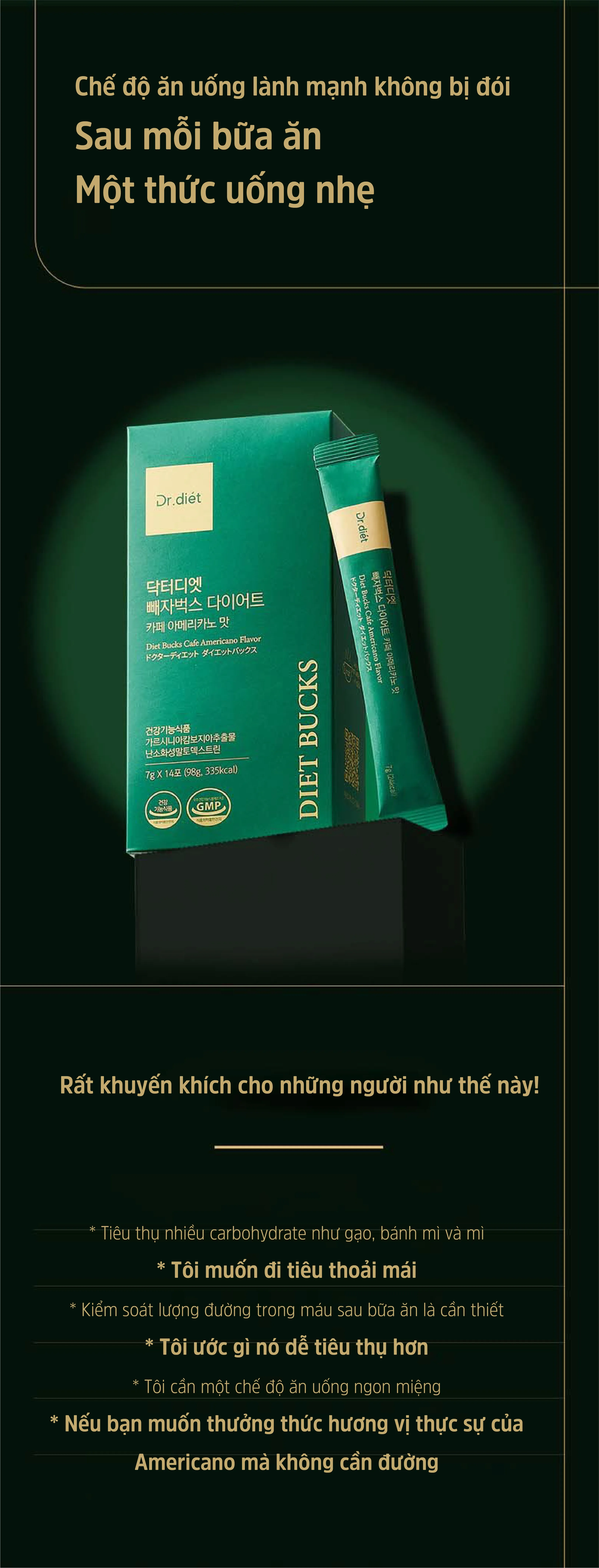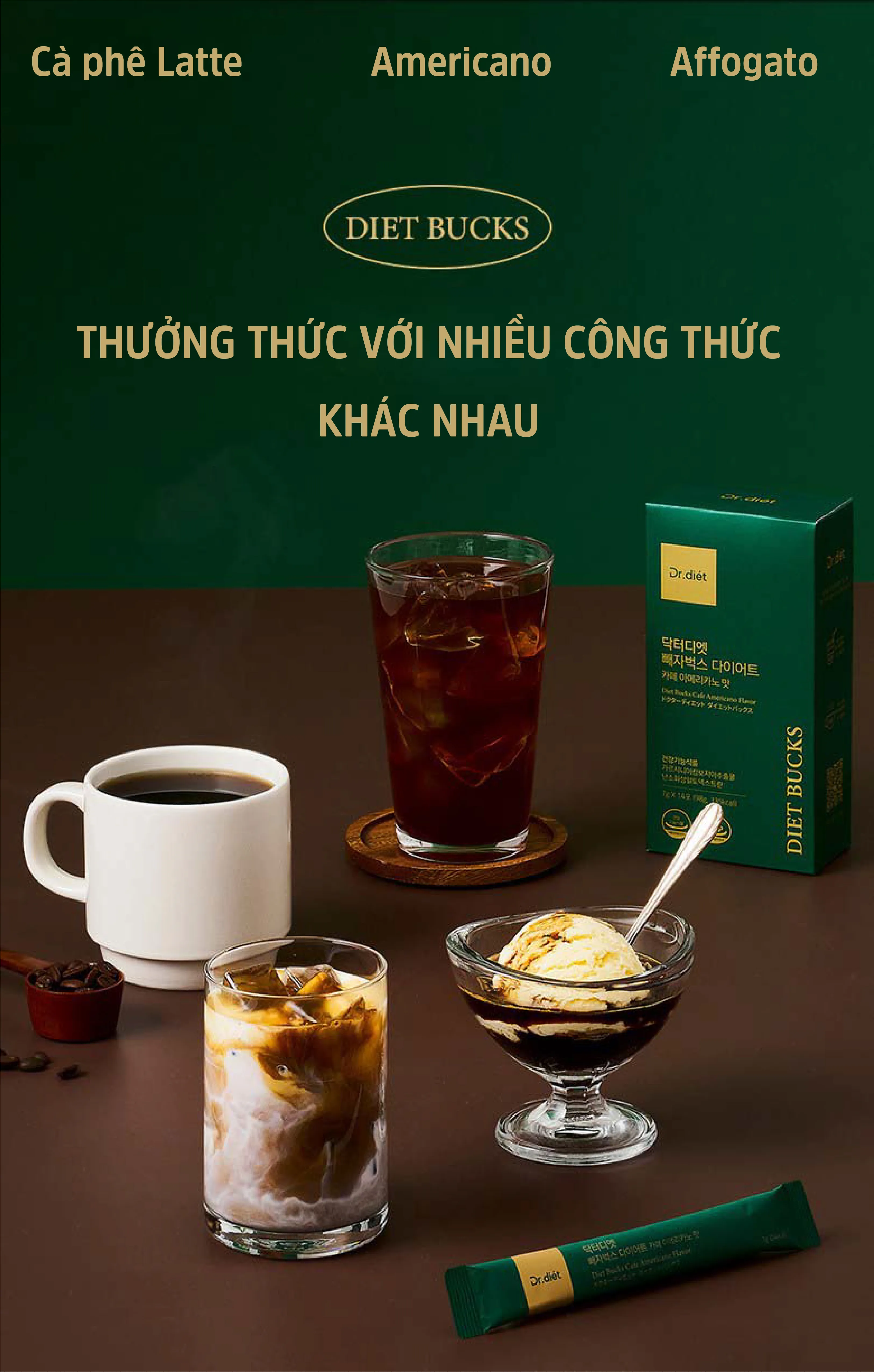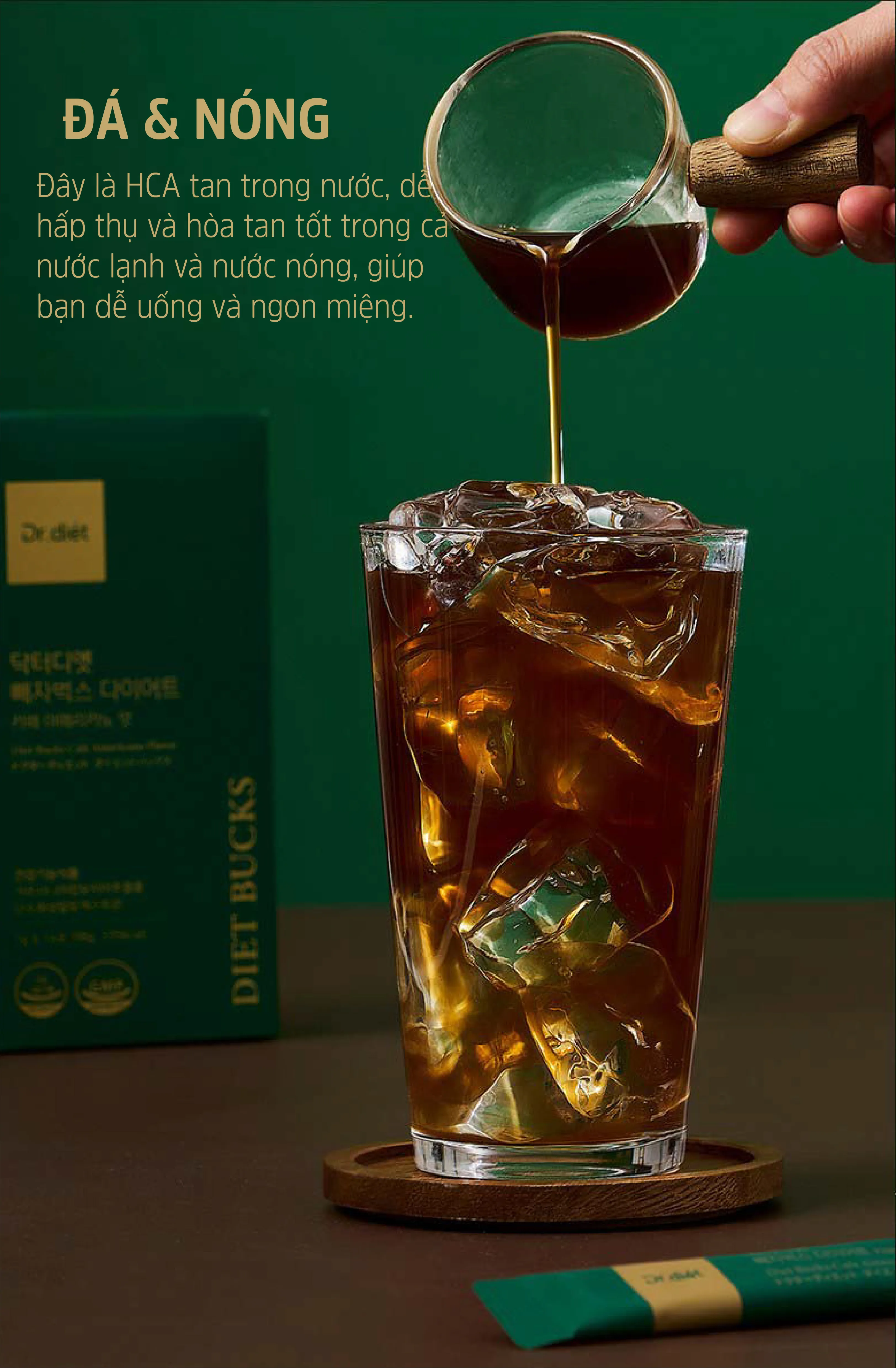 Maltodextrin không tiêu hóa [chất xơ ăn kiêng 85% trở lên, ngô (nhập khẩu: Nga, Hungary, Serbia, v.v.)] 36%, chiết xuất Garcinia cambogia (tổng HCA 60% trở lên, Ấn Độ) 9,2%, bột cà phê [hạt cà phê (nhập khẩu: Brazil, Peru, Việt Nam, v.v.)], bột hạt cà phê, silicon dioxide (chất chống đóng cục), bột chiết xuất hạt cà phê xanh, bột chiết xuất mate, bột chiết xuất trà xanh, bột chiết xuất hạt xoài Châu Phi