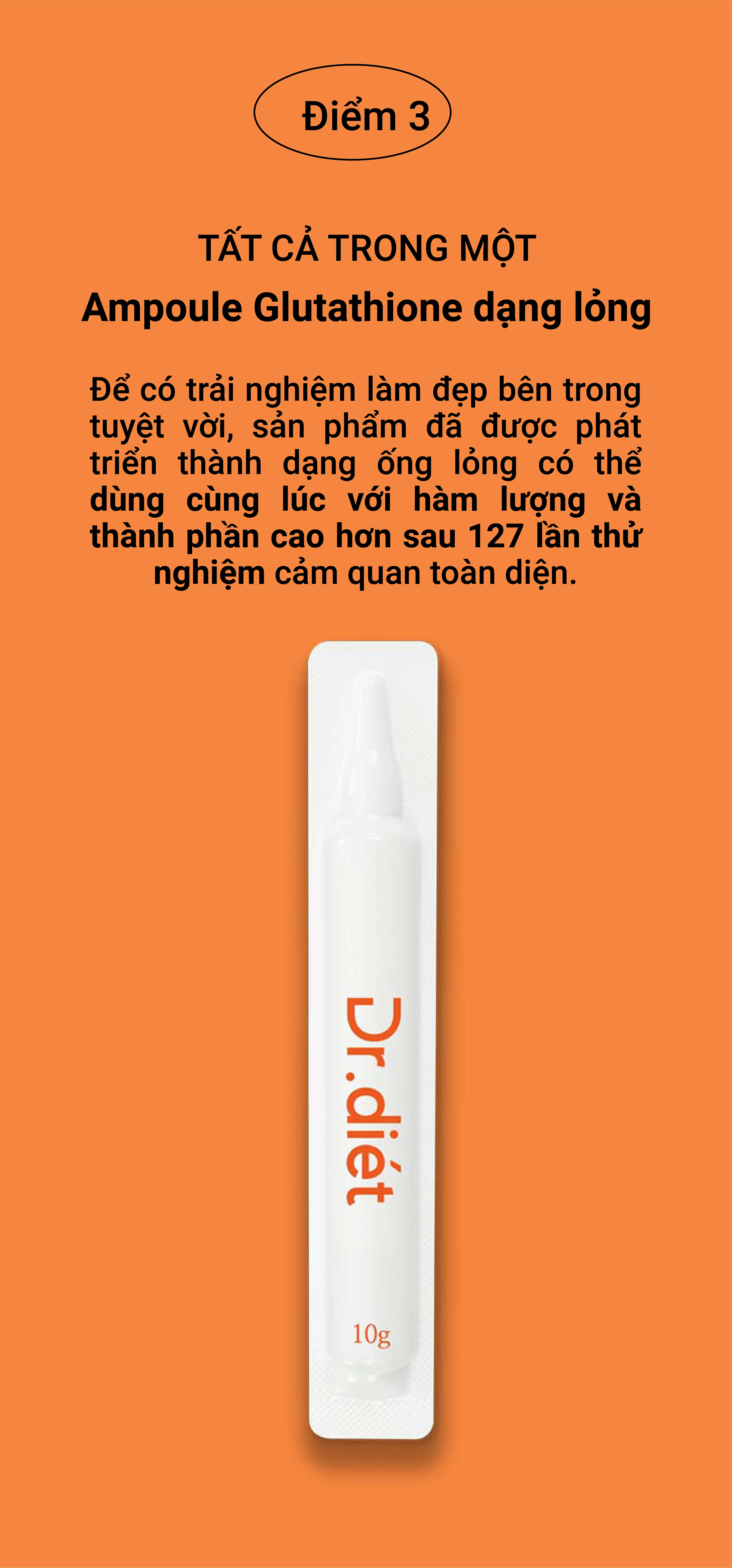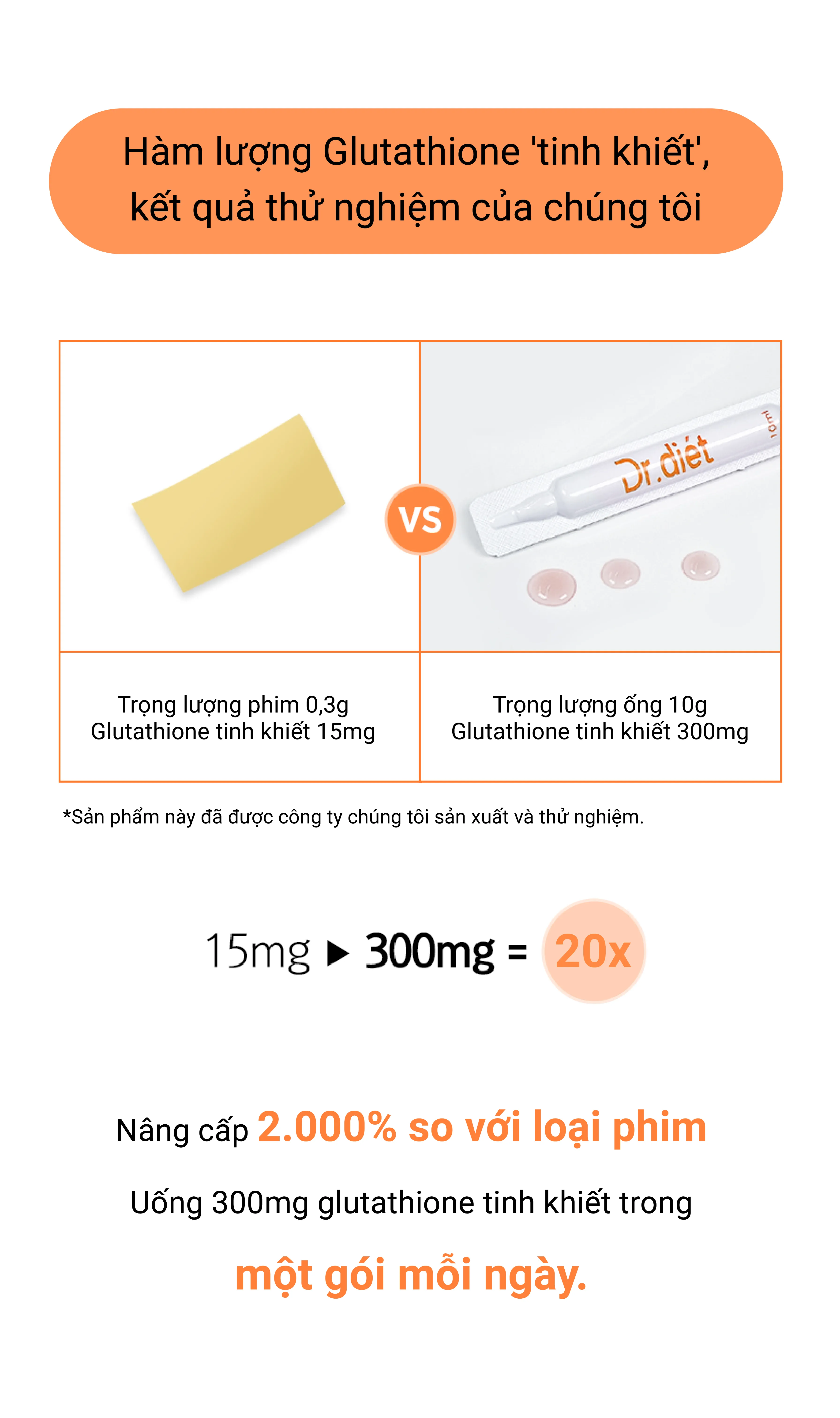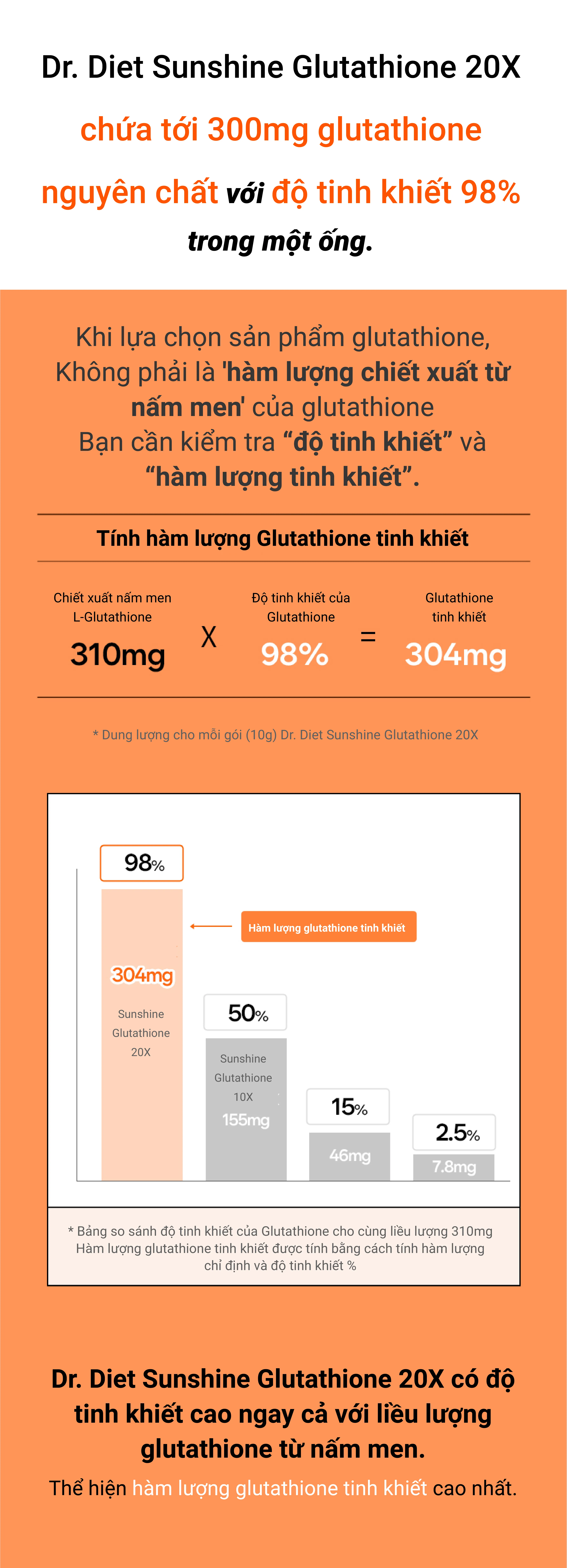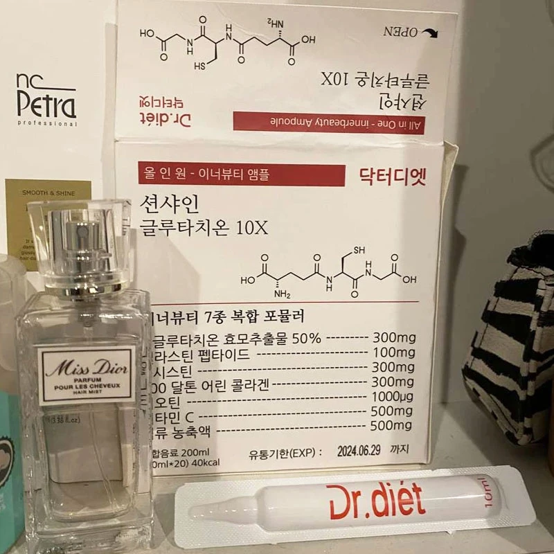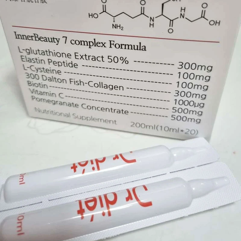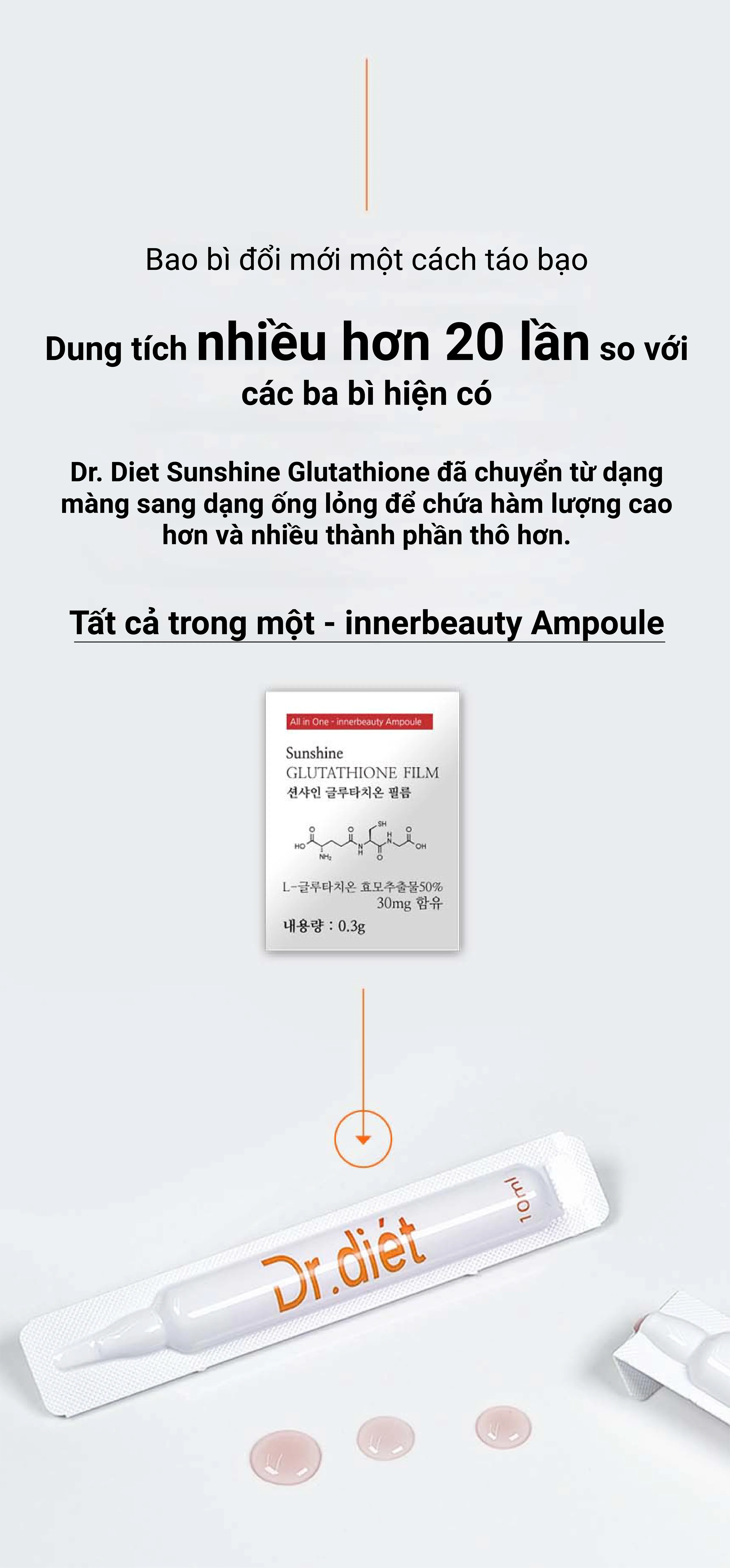 Dr Diet Sunshine Glutathion 20X với 7 nguyên liệu làm đẹp được tổng hợp trong 1 ống làm đẹp, hàm lượng vượt trội và độ tinh khiết lên tới 98%. Được nâng cấp gấp 20 lần với hàm lượng glutathione tinh khiết và hàm lượng axit hyaluronic tăng lên.
