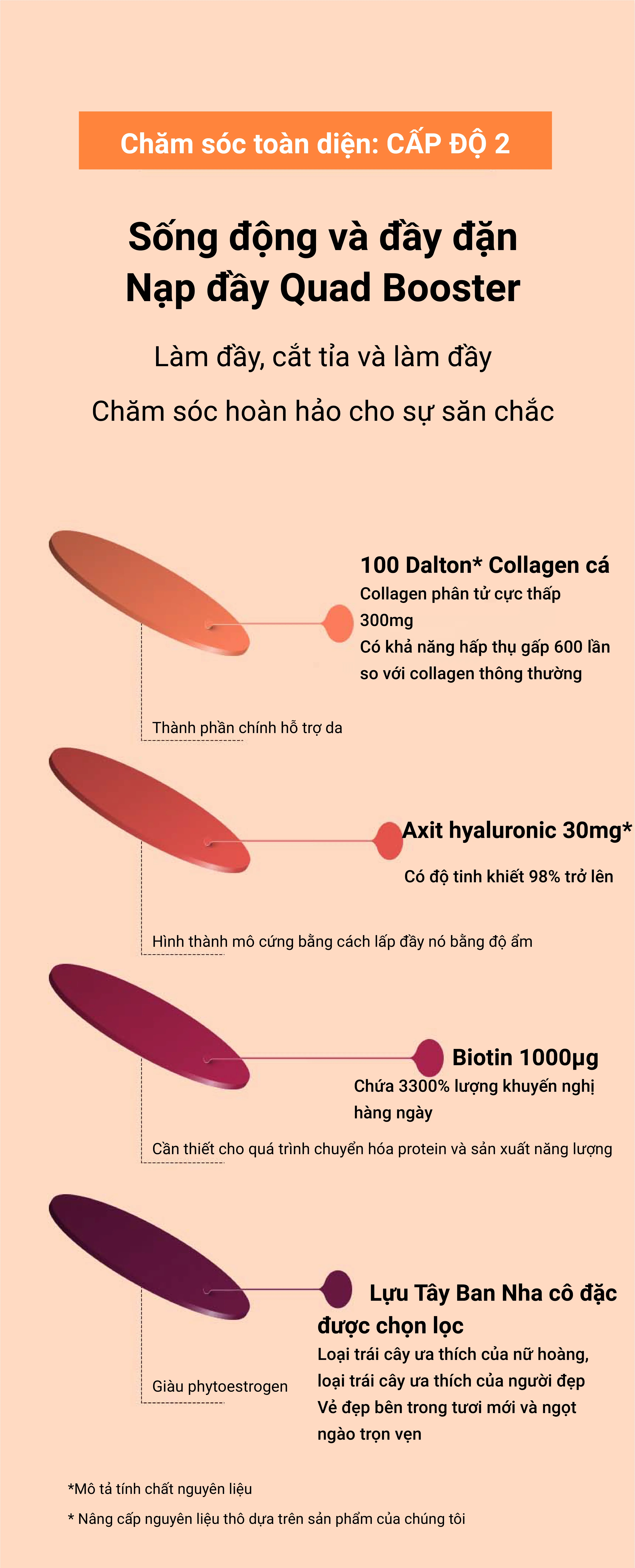 L- Glutathion, L- Cysteine, Vitamin C, Biotin, 300 Dalton collagen, Peptide đàn hồi, Tinh chất lựu cô đặc...