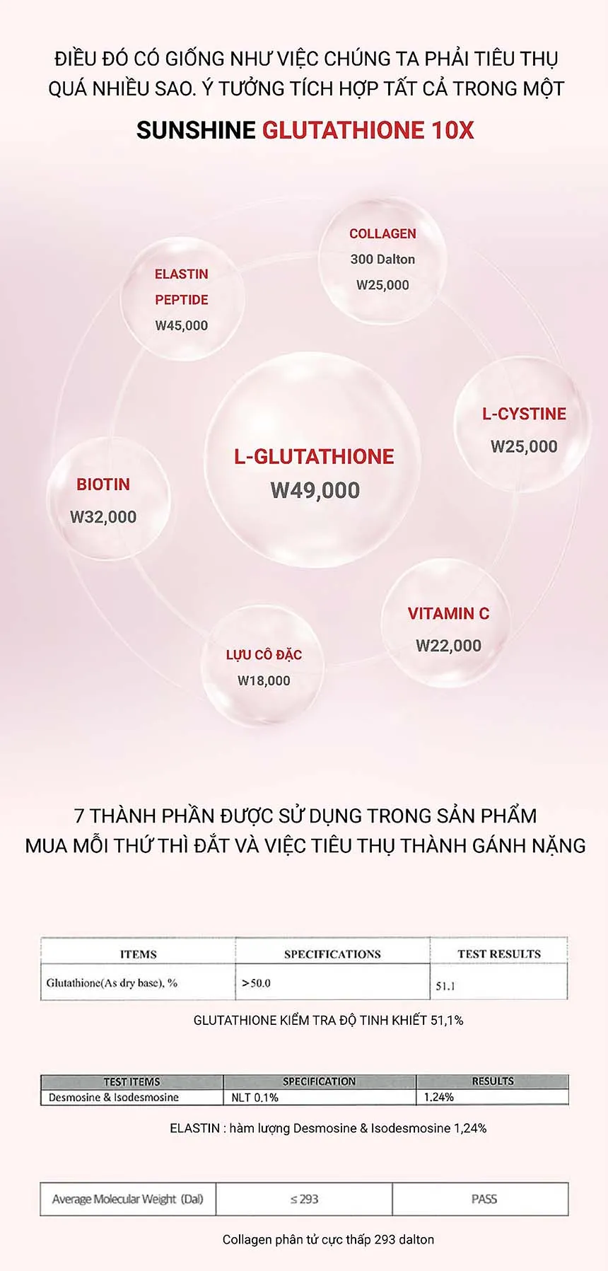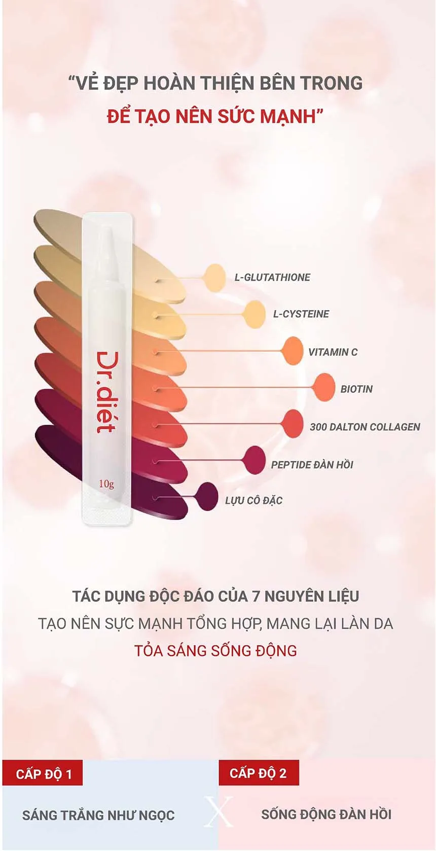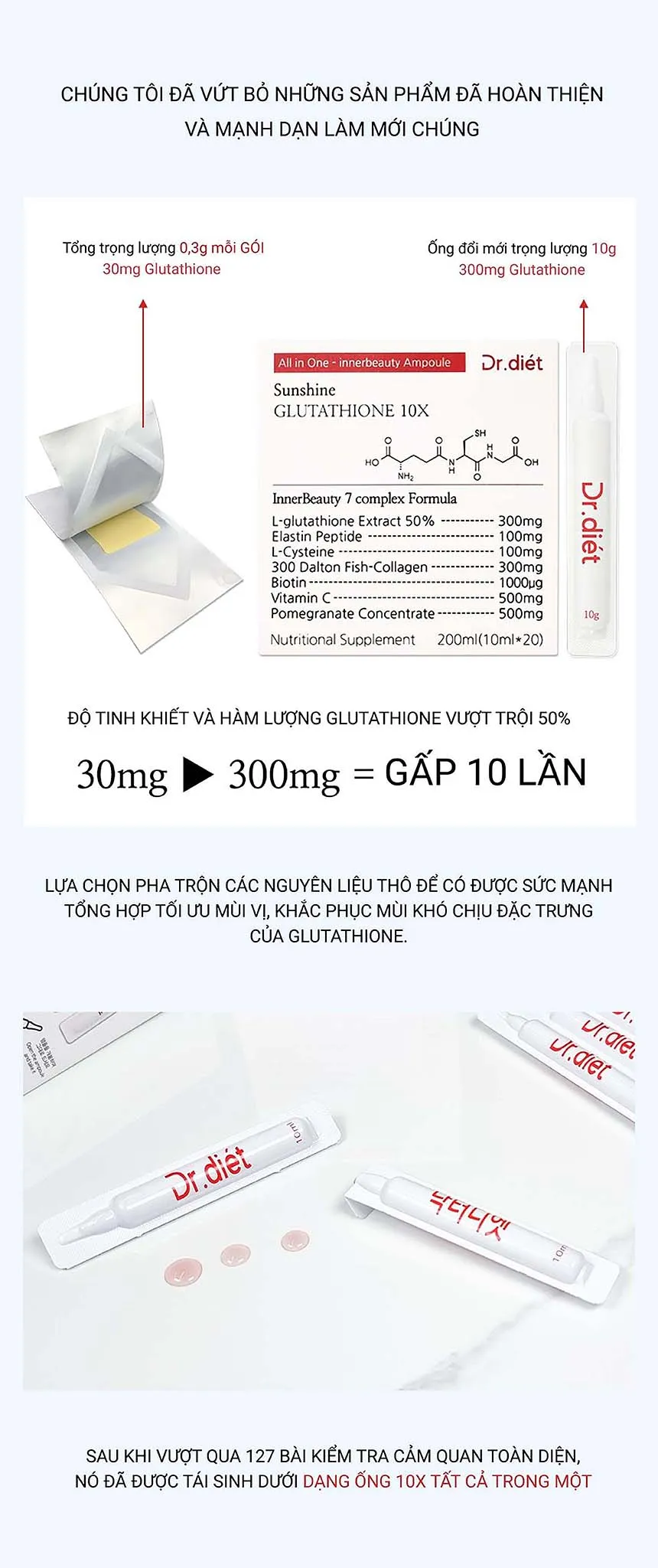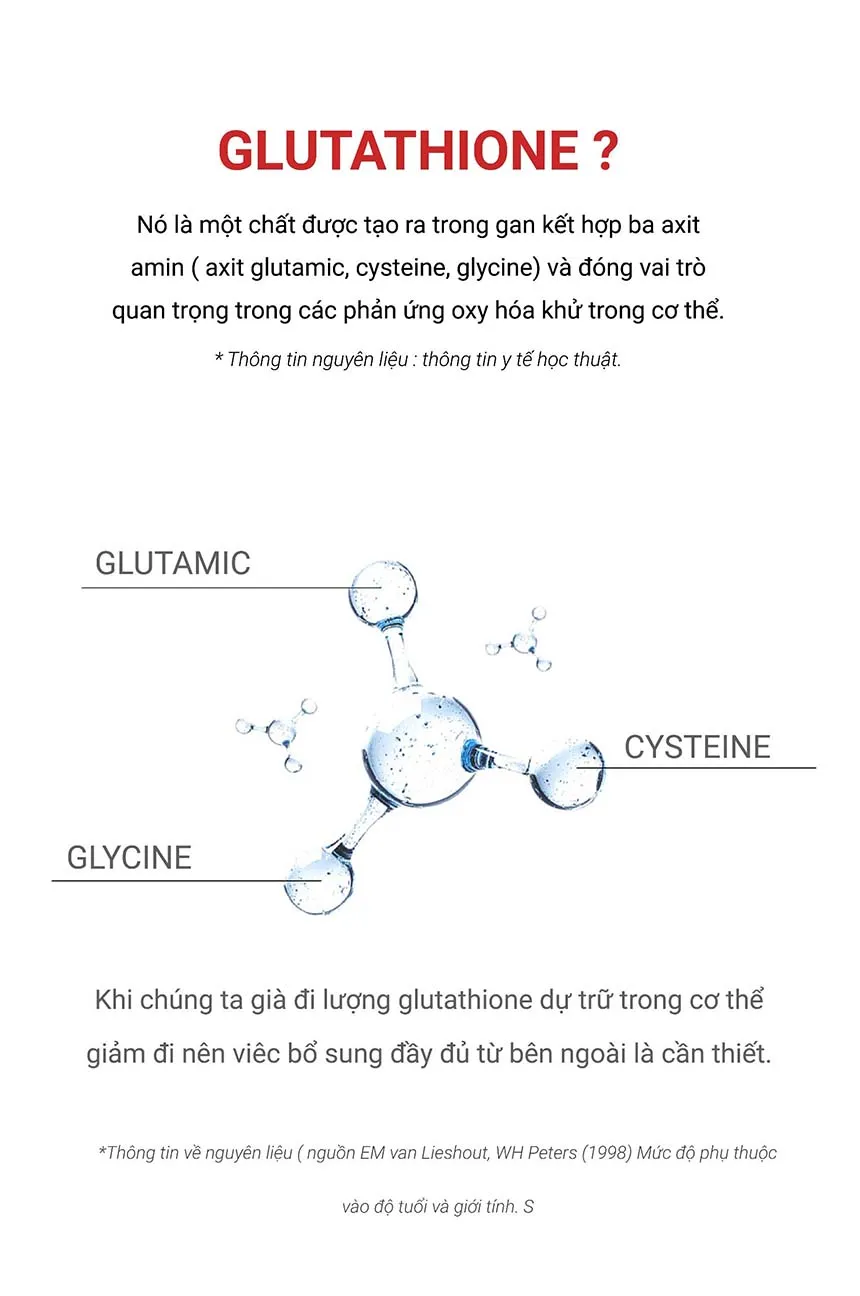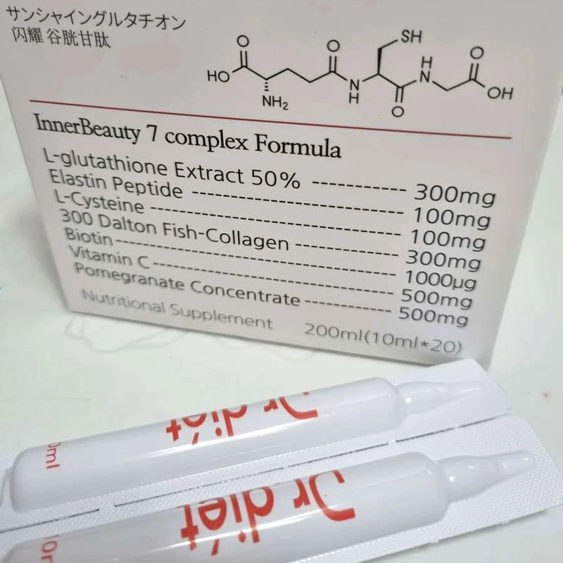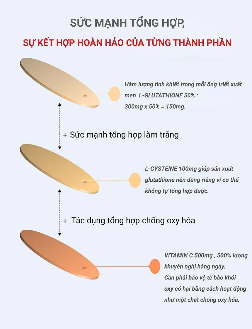 L- Glutathion, L- Cysteine, Vitamin C, Biotin, 300 Dalton collagen, Peptide đàn hồi, Tinh chất lựu cô đặc...