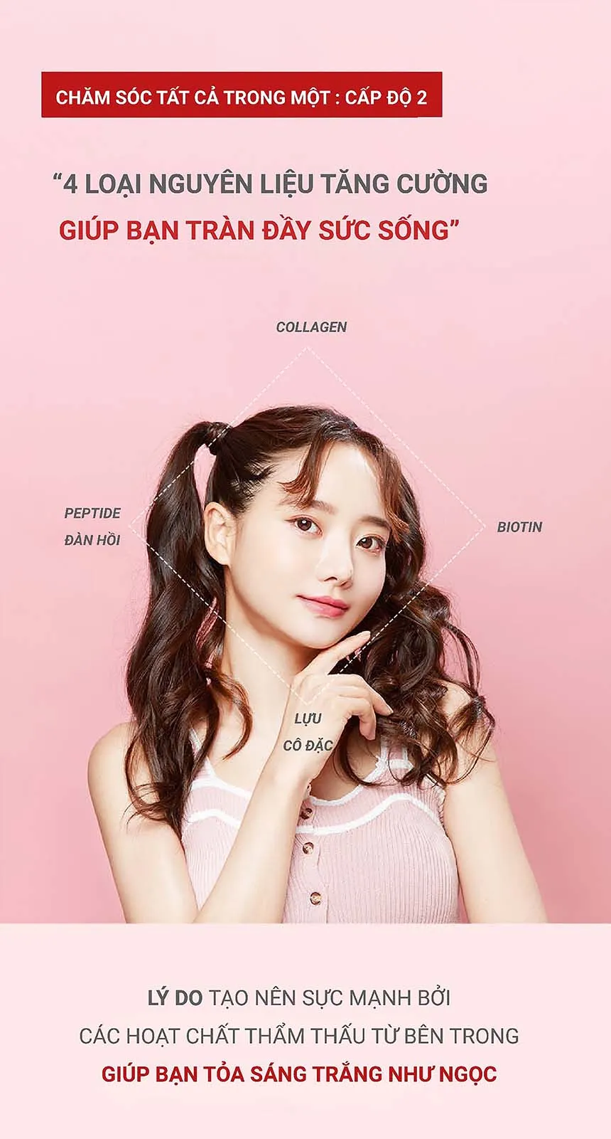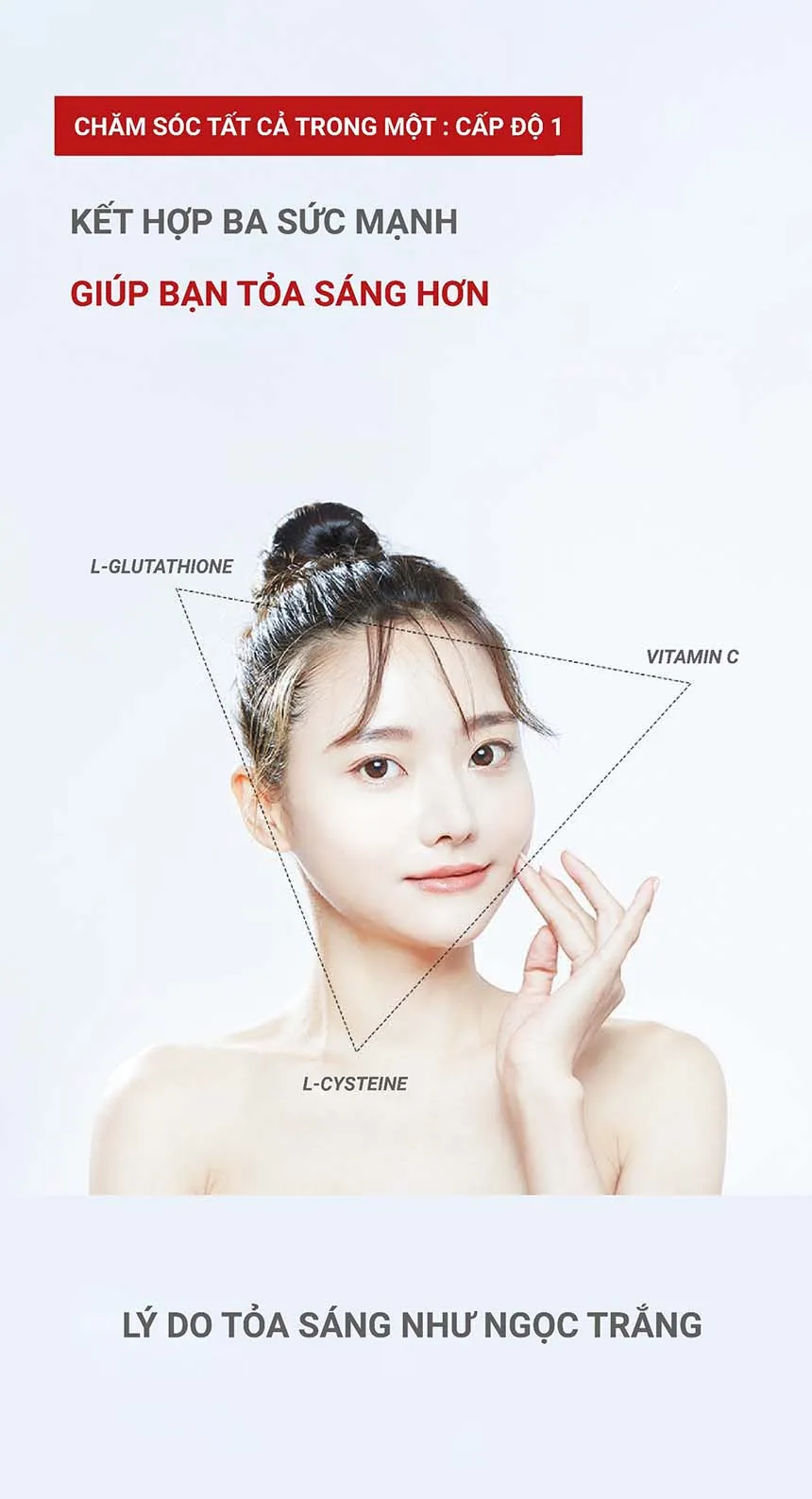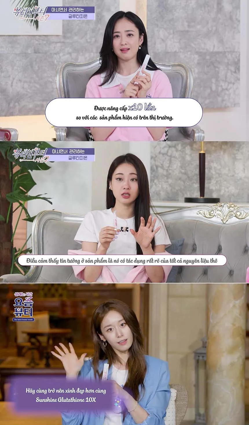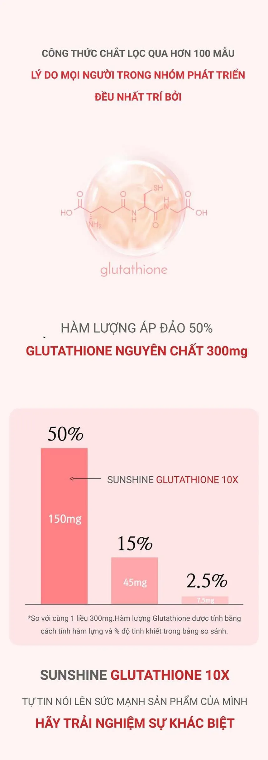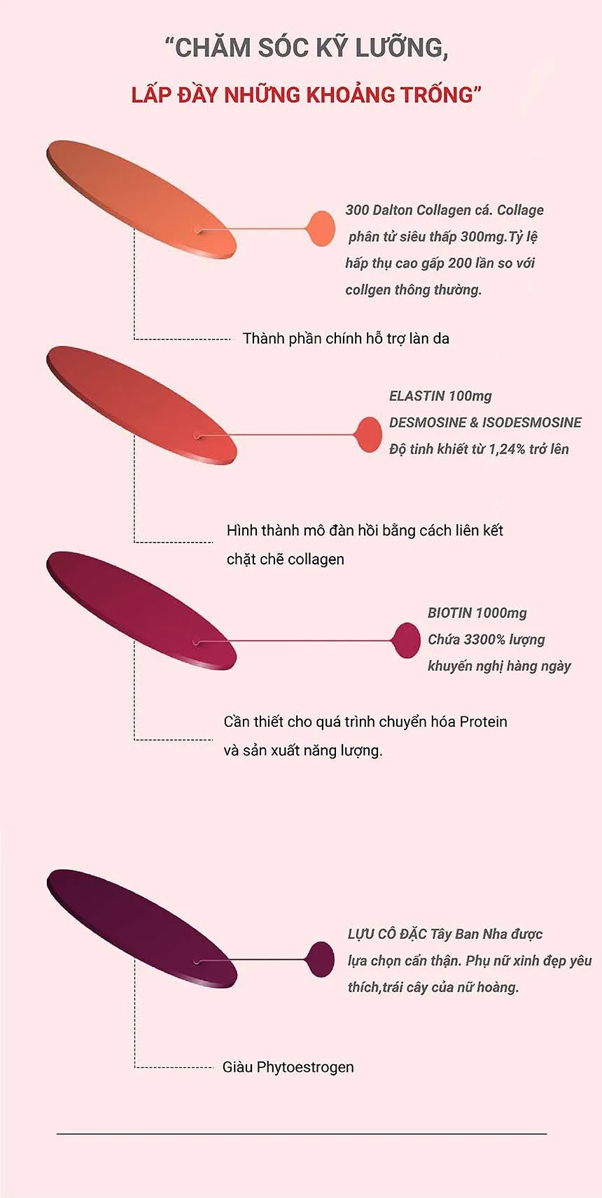 L- Glutathion, L- Cysteine, Vitamin C, Biotin, 300 Dalton collagen, Peptide đàn hồi, Tinh chất lựu cô đặc...
