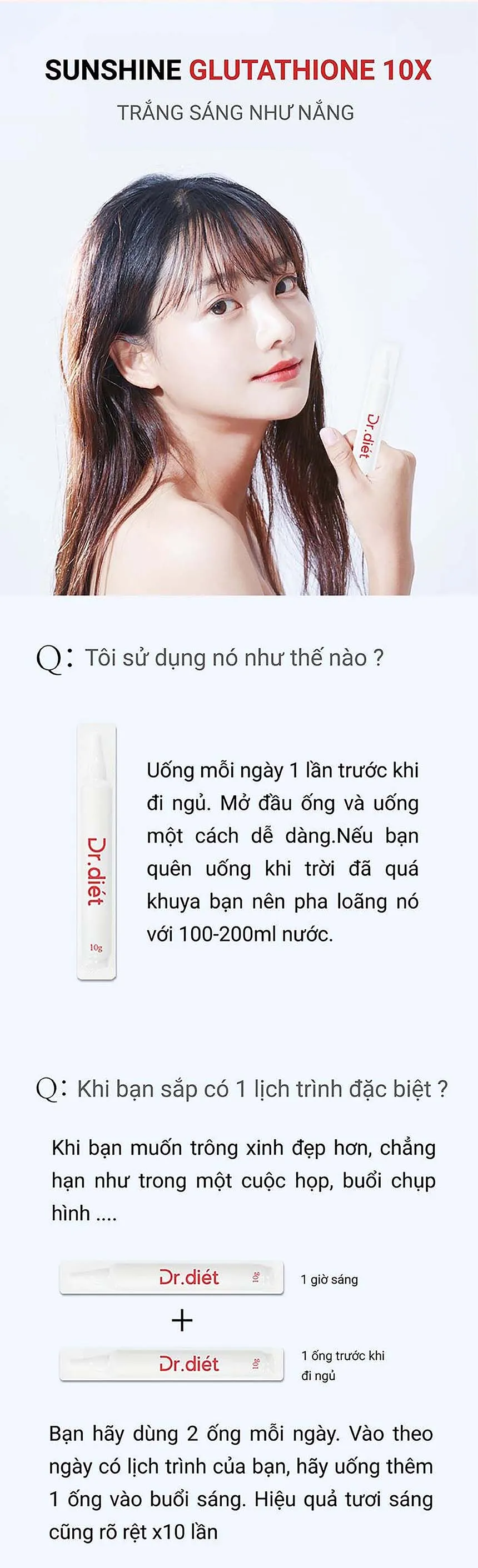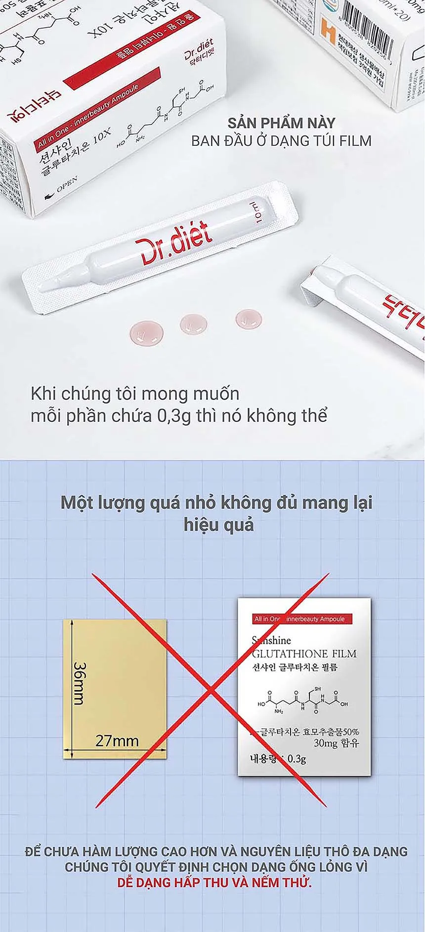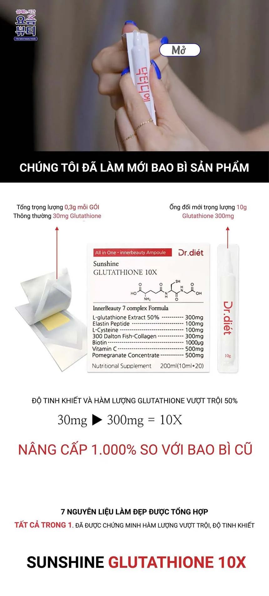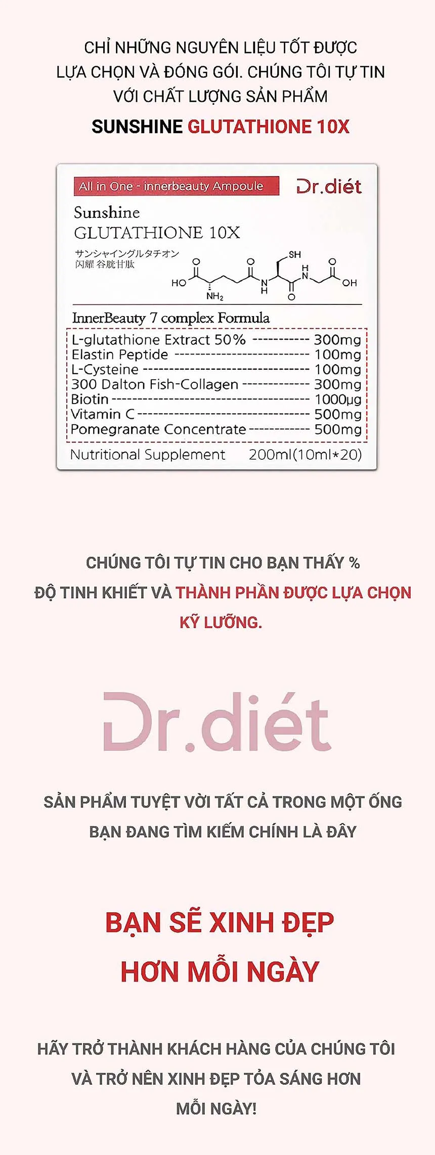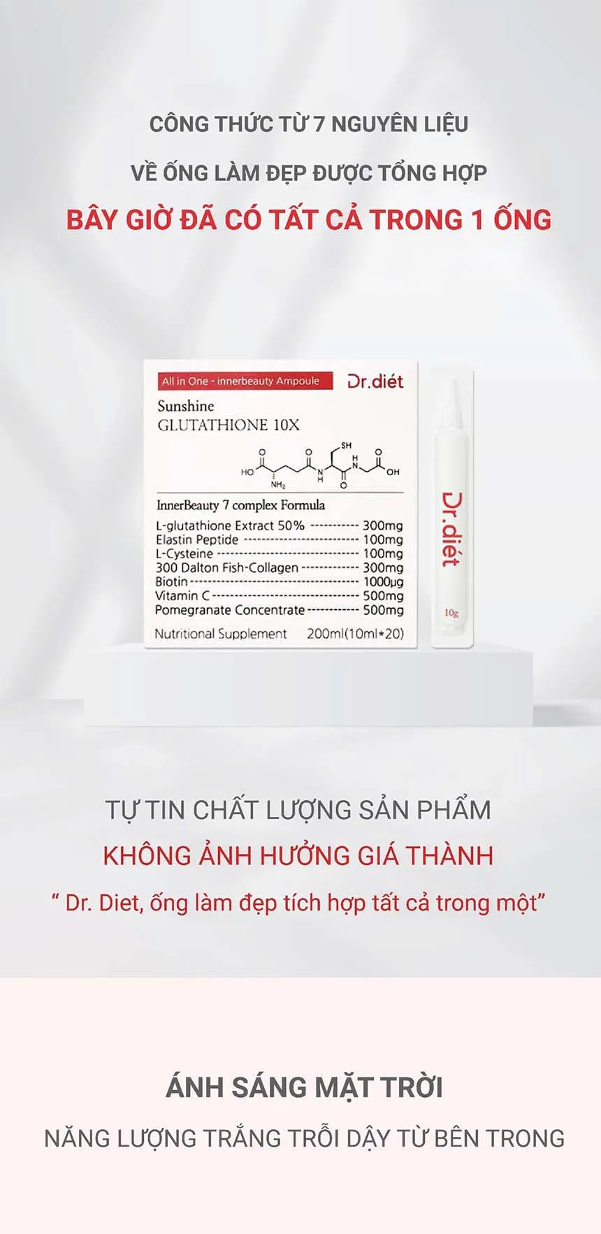 Dr Diet Sunshine Glutathion 10X với 7 nguyên liệu làm đẹp được tổng hợp trong 1 ống làm đẹp, hàm lượng vượt trội và độ tinh khiết. Bao bì đổi mới giúp sử dụng tiện lợi, bảo quản chất lượng. ÁNH SÁNG MẶT TRỜI : Năng lượng trắng trỗi dậy từ bên trong.