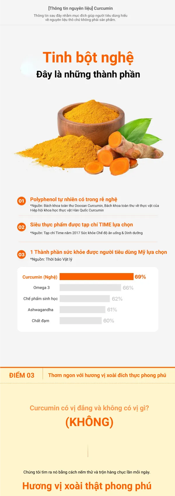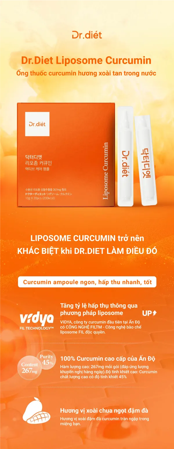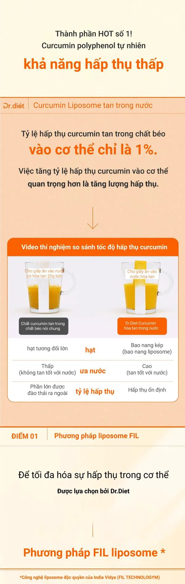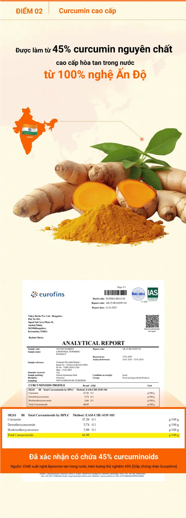 Bên cạnh đó, việc tiêu thụ nghệ hoặc chất curcumin trong nghệ có thể giúp bạn chống lại các loại viêm đại tràng, cholesterol cao và loét dạ dày. Hơn nữa, nhiều người cũng đã sử dụng nghệ để điều trị cho chứng đau dạ dày, bệnh tiểu đường, HIV, trầm cảm, nhiễm vi rút và viêm màng bồ đào. Với công nghệ mới tăng tỷ lệ hấp thụ vào cơ thể với phương pháp bọc liposome Fil độc quyền tại Ấn Độ. 100% curcumin cao cấp từ nghệ tại Ấn Độ kết hợp hương vị xoài thơm ngon. Liposome curcumin là lựa chọn bổ sung curcumin tiện lợi và hiểu quả bậc nhất